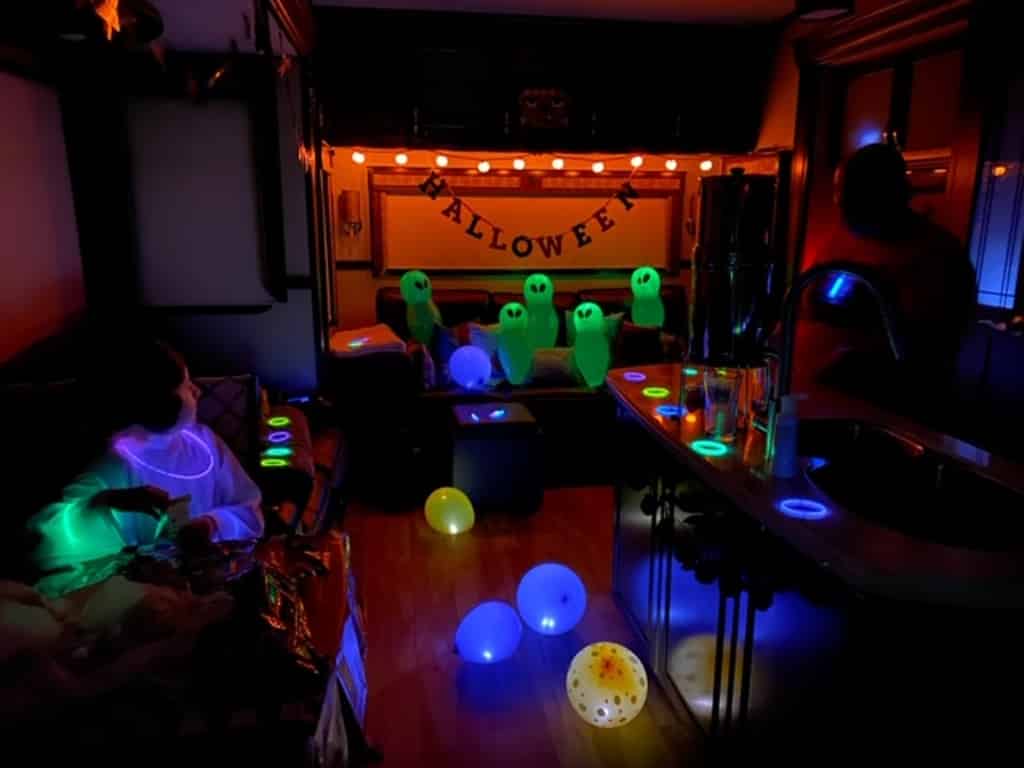 After you finish the glow candy hunt, gather all the glow jewelry, blow up some glow balloons, and crank up the Halloween music.